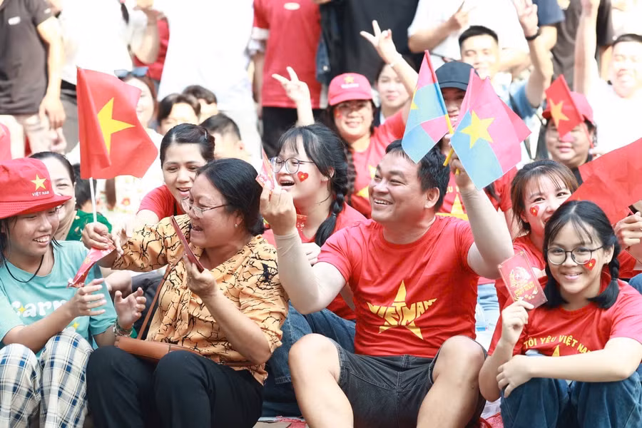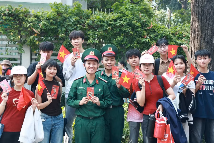 Sáng 30/4, khu vực trung tâm TPHCM rợp cờ đỏ sao vàng và kín đặc người dân đổ về xem diễu binh, diễu hành. Giữa dòng người reo hò là hình ảnh du khách nước ngoài đội nón tai bèo, quấn khăn rằn, hòa mình vào không khí hào hùng của đại lễ 50 năm Ngày Giải phóng miền Nam - Thống nhất đất nước.