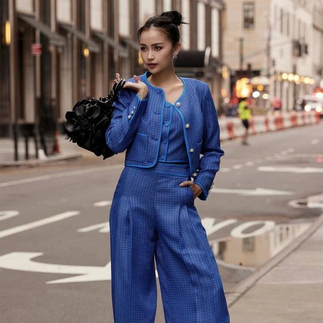 Sức hút của những trang phục tweed khi được kết hợp theo phong cách đồng màu cùng chất liệu và màu sắc càng khiến nàng tỏa sáng. Hiện đại, trẻ trung và mới mẻ, áo tweed dáng ngắn màu xanh dương mỗi khi kết hợp cùng quần suông ống rộng và những đôi cao gót đã giúp phái đẹp "hack dáng" vô cùng thuyết phục