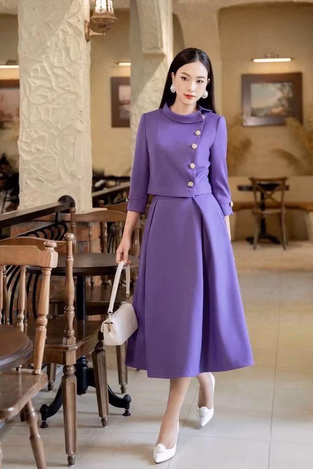 Với dấu hiệu lên ngôi của sắc tím trong mùa mốt Xuân Hè 2024, các quý cô sành mốt nhất định không nên bỏ lỡ bộ đồ đặc biệt này. Sở hữu màu tím lạnh được phối cùng tông dễ dàng ứng dụng trong môi trường công sở. Thiết kế dáng vest lửng tay lỡ với điểm nhấn là cổ áo cài khuy lệch độc đáo kết hợp cùng chân váy midi xếp ly to xòe bồng giúp người mặc che giấu khuyết điểm cơ thể. Nàng chỉ cần phối cùng một đôi giày cao gót và xách chiếc túi cùng tông là tạo nên một diện mạo cực bén, nổi bật sắc thái thanh lịch và chuyên nghiệp cần thiết