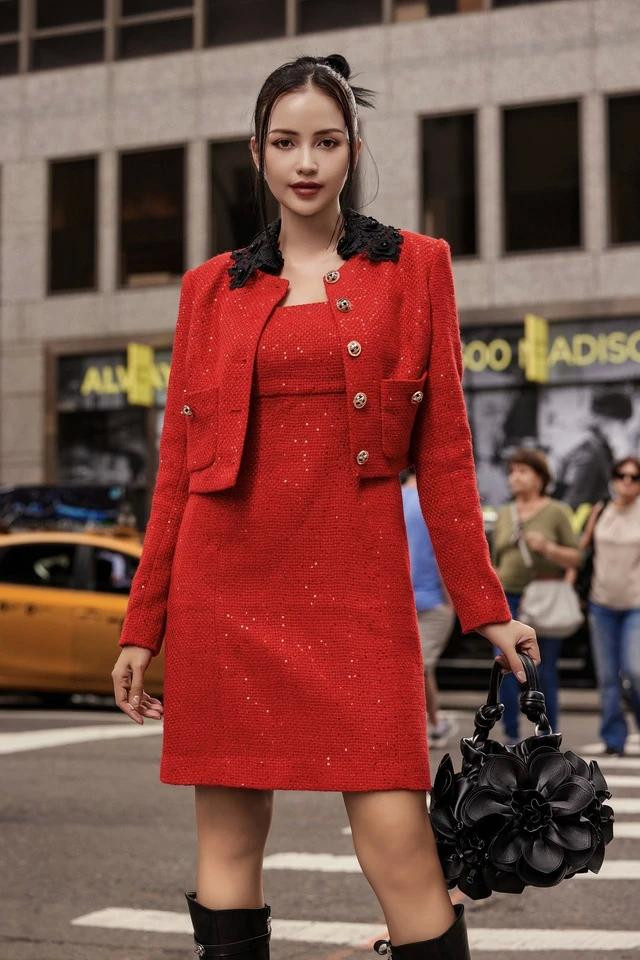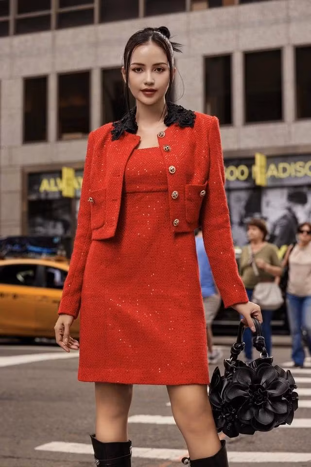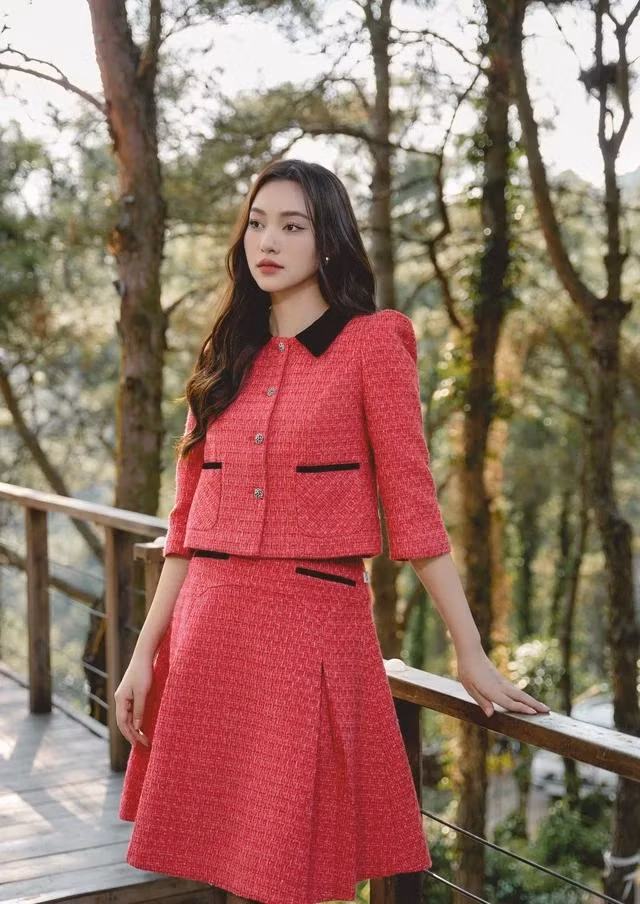 Bước vào mùa lễ hội, những trang phục sắc đỏ được ưu ái lăng xê với mật độ và tần suất dày đặc hơn thường ngày. Vẫn hướng phong cách tối giản và tinh tế để tôn lên những đường sọc vải của chất liệu vải tweed, bộ đồ đã mang lại những bản phối với tông màu thời thượng, chuẩn tinh thần ngày đầu năm. Ẩn chứa trong những bộ đồ hiện đại và thanh lịch là hình ảnh quý cô quyến rũ, rực rỡ và tỏa sáng