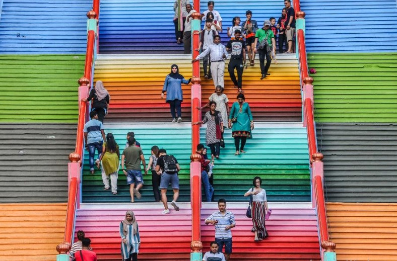 Các hang động Batu, Malaysia, quê hương của 13 ngôi đền Hindu, đã có sự thay đổi bề ngoài lớn vào tháng năm 2018. 272 bước dẫn đến các hang động được vẽ cầu vồng là một phần của dự án cải tạo. Ảnh: FIRDAUS LATIF