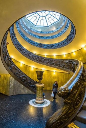 Lấy cảm hứng từ Cầu thang Bramante nguyên bản do Donato Bramante tạo ra vào năm 1505, đến năm 1932, tại TP Vatican, kiến trúc sư người Ý Giuseppe Momo đã thiết kế cầu thang mang tính biểu tượng cho phép mọi người lên và xuống mà không cần đi qua đường. Lan can bằng đồng trang trí công phu xung quanh cầu thang được chiếu sáng bởi trần kính phía trên. Ảnh: RAYMOND CHOO