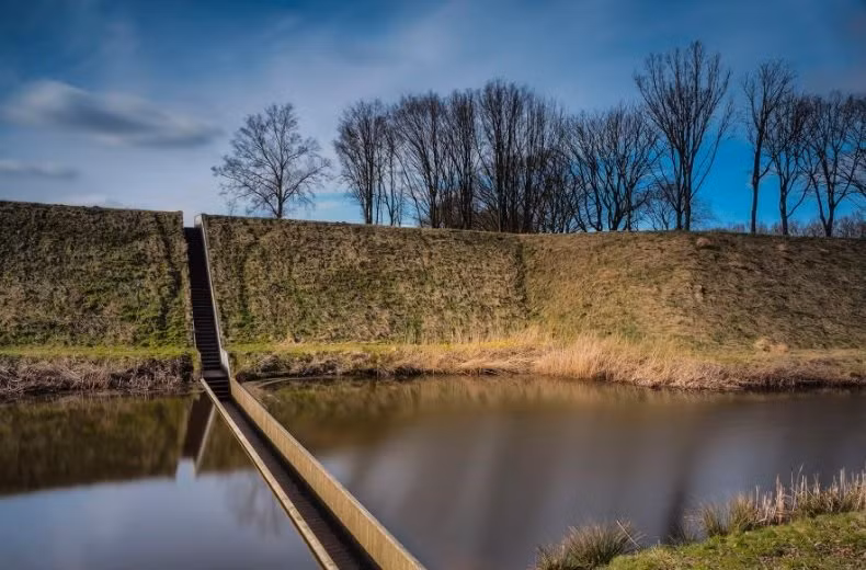 Giờ đây, du khách có thể khám phá Pháo đài de Roovere, Halsteren, Hà Lan và đắm mình trong hào nước của pháo đài nhờ cầu thang Moses. Ban đầu, đây là một hòn đảo không thể tiếp cận, các nhà xây dựng đã tạo ra một cây cầu chìm để giữ gìn vẻ ngoài tự nhiên của hòn đảo. Du khách đi bộ qua hào nước bằng cây cầu chìm và hai con đập ở mỗi đầu bảo đảm mọi người luôn khô ráo. Ảnh: HENK GOOSSENS