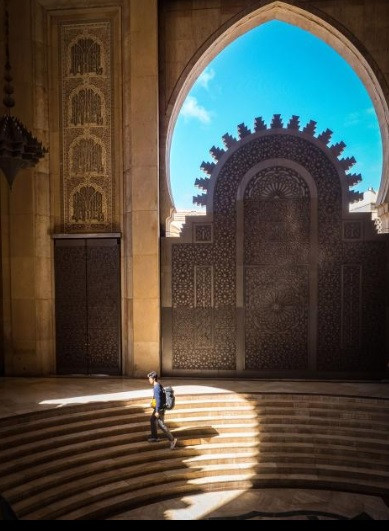 Cầu thang bằng đá cẩm thạch trong Nhà thờ Hồi giáo Hassan II, ở Casablanca, Ma-rốc, một trong những nhà thờ Hồi giáo lớn nhất ở châu Phi với vòm cao vút, cửa sổ rộng và trang trí bằng chạm khắc gỗ. Ảnh: CHRIS PAYANT