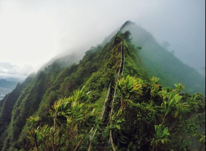 Một con đường được sử dụng trong Thế chiến lần thứ II để lên ăng-ten của đài phát thanh trên đỉnh Puu Keahi a Kahoe, Hawaii, Mỹ. Cầu thang Haʻikū, còn được gọi là Cầu thang lên thiên đường cao gần 2.500 feet (762m), với gần 4.000 bước. Nó cung cấp tầm nhìn tuyệt đẹp của hòn đảo, tuy nhiên việc leo cầu thang đã bị cấm. Nếu bị bắt khi đi bộ lên, bạn có thể bị phạt với khoản tiền hàng nghìn đô la trên đường xuống. Ảnh: ANTHONY SAVINO