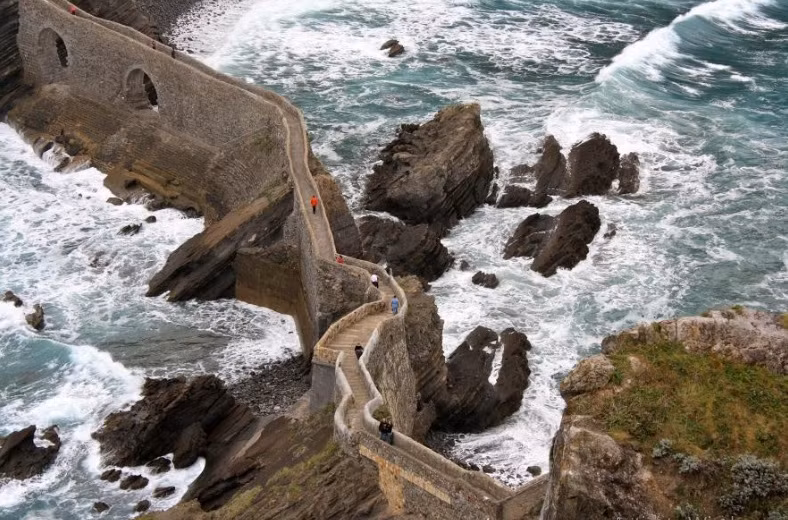 Hòn đảo nhỏ San Juan de Gaztelugatxe, Tây Ban Nha được kết nối với đất liền bằng một cây cầu đá. Con đường hẹp ngoằn ngoèo với hơn 241 bậc thang dẫn đến một nhà thờ từ thế kỷ thứ 10 khiến du khách sợ hãi. Có một truyền thuyết địa phương rằng sau khi bạn đạt đến đỉnh, bạn nên rung chuông nhà thờ ba lần và một điều ước sẽ thành hiện thực. Ảnh: MARIE MARTRAIRE