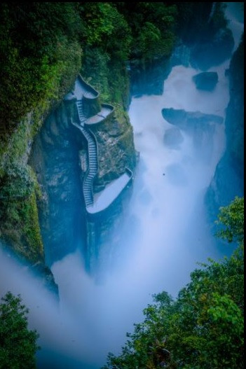 Cầu thang xung quanh thác nước ấn tượng El Pailón del Diablo, Banos, Ecuador, được trang trí với các bục quan sát. Du khách được khuyến cáo dung áo mưa để khỏi ướt và phải bước cẩn thận để tránh trơn trượt. Ảnh: BIJANZ A