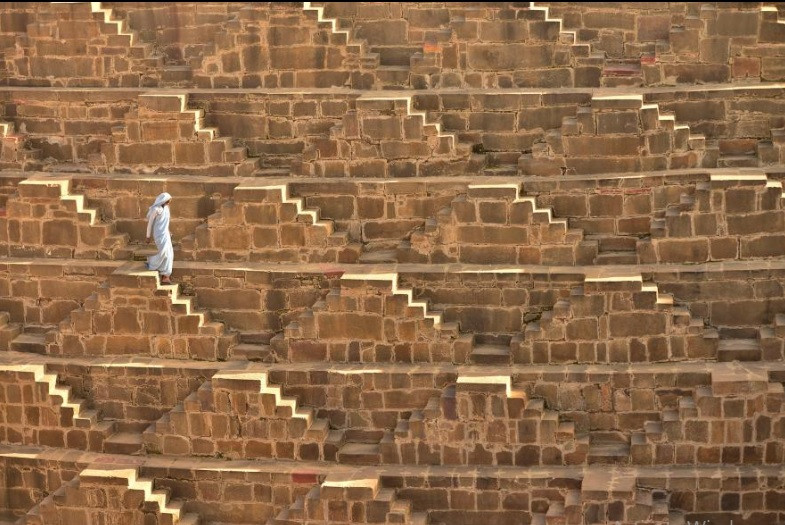 Bậc thang Chand Baori ở Abhaneri, Rajasthan, Ấn Độ, bao gồm 3.500 bước rất hẹp trong 13 tầng, là một trong những cầu thang lớn nhất trên thế giới. Trong Ấn Độ giáo, nước là ranh giới an toàn giữa trời và đất, nước cung cấp sức mạnh gột tẩy tội lỗi. Cầu thang Chand Baori không chỉ là nơi mọi người có thể tụ tập để tìm nước và tránh nóng, mà còn là thiên đường để tắm, cầu nguyện và thiền định. Ảnh: HAIRUL AZIZI HARUN