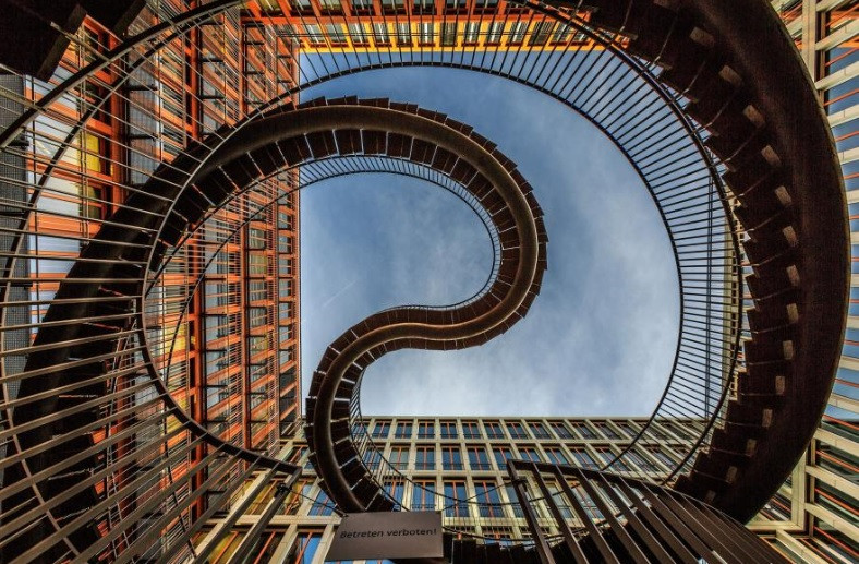 Nằm ngay bên ngoài trạm dừng xe điện Bahnhof St. Johann ở trung tâm thành phố Basel, Thụy Sĩ, những bậc thang này xoắn ốc lên đến các tầng trời. Ảnh DOMINIK GEHL