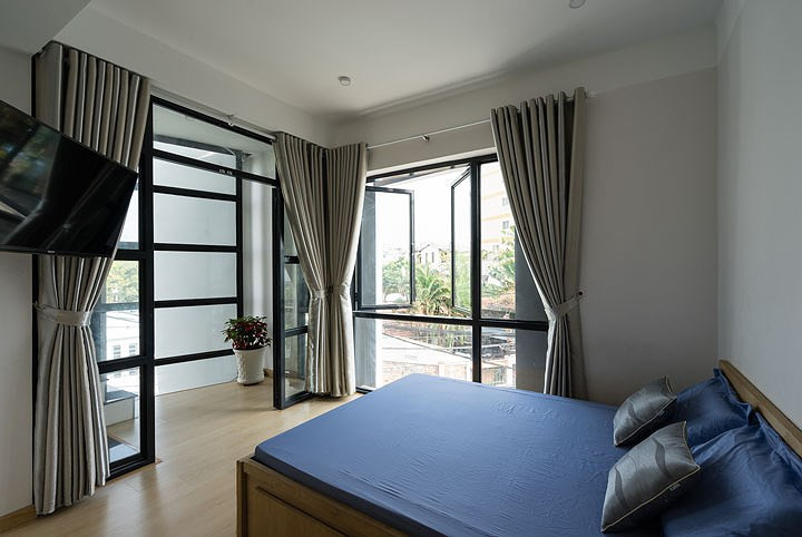Không gian phòng ngủ đơn giản, màu sắc trung tính, sử dụng cửa kính nên trong phòng luôn ngập tràn ánh sáng.