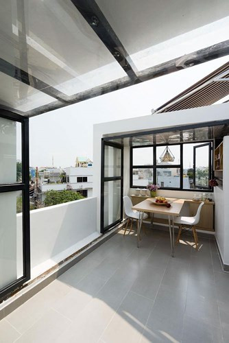 Diện tích còn lại làm phòng khách, như một không gian mở không mái. Phần mái sử dụng kính chữ L bằng thủy tinh.