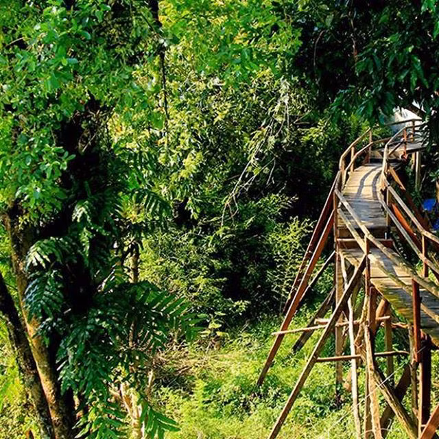 Thi thoảng, một vài “vị khách” sẽ bất ngờ xuất hiện, khi là chú nai nhỏ lướt ngang, khi là con công với bộ đuôi xòe rộng khoe sắc hoặc vài cặp khỉ leo trèo trên các cành cây. Chưa kể vào đó là hàng loạt các loại cây lạ, hoa thơm trải dọc lối đi.