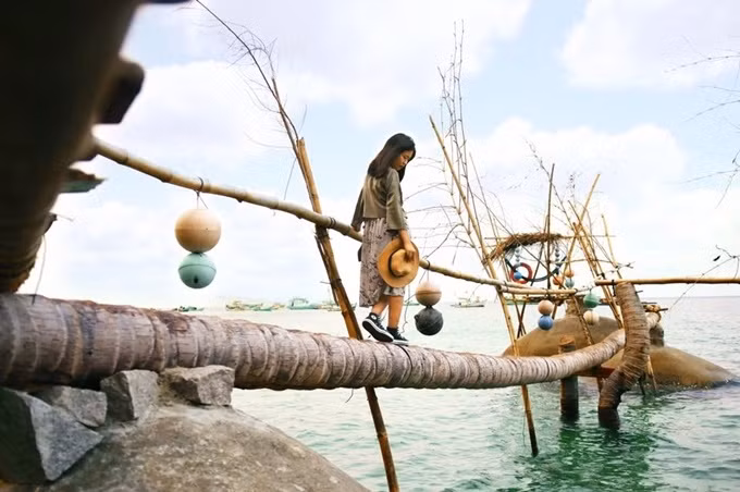 Những cây dừa đổ ngang cũng được tạo thành cây cầu xinh xắn. Hai điểm đến nổi bật nhất trên hòn đảo nhỏ này là đỉnh Ma Thiên Lãnh và Bãi Bàng. Bạn nên đi Ma Thiên Lãnh vào buổi sáng, tắm biển buổi chiều.