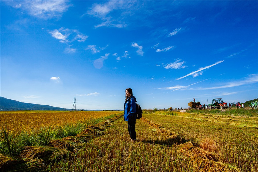 | Đường đến nhà thờ cổ H'Bâu đi qua một vùng chiêm trũng mà người dân ở đây quen gọi là "cánh đồng Ngô Sơn". Mạch ngầm từ lòng núi là "bầu nước ngọt" vô tận nuôi dưỡng những mùa vàng dưới chân ngọn Chư Nâm. Nước nguồn từ đây lại chảy mãi cho đến khi đổ ra hồ T'Nưng. Vào tháng 11, những thửa ruộng được tháo nước chờ đến ngày thu hoạch. Ảnh: Chu Thế Dũng |
