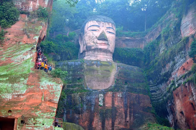 Khi đến thăm Nga Mi, du khách cũng sẽ được chiêm ngưỡng bức tượng Đại Phật Lạc Sơn tạc trên vách núi lớn nhất thế giới. Tượng cao 71 m và được chế tác trong 90 năm. Đỉnh đầu có 1.021 búi tóc, phần móng tay của bức tượng cũng đủ cho một người ngồi. Đại Phật Lạc Sơn cùng với Nga Mi Sơn đã được UNESCO công nhận là Di sản thế giới năm 1996. Ảnh: ChinaImage.
