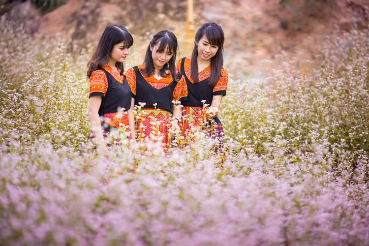 Chụp ảnh lưu niệm tại vườn hoa tam giác mạch trong Công viên. Ảnh: TTDS