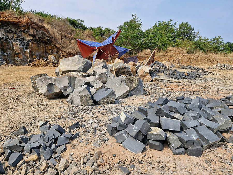 Từ cổng chào làng Mook Trêl xuôi theo con đường bê tông khoảng 2 km, sau đó rẽ trái hơn 1 km trên con đường đất gồ ghề vì bị xe chở đá băm nát, bãi khai thác đá trái phép hiện ra trước mắt chúng tôi với ngổn ngang đá chẻ và rất nhiều hố sâu. Tại hiện trường, trên diện tích khoảng 2 sào, đối tượng khai thác đá đã san lấp, tạo mặt bằng để xe ra vào chở đá thuận lợi hơn. Những đống đá được xẻ vuông vức 30 x 20 cm nằm ngổng ngang, cạnh đó là những chiếc dù, bạt che nắng để nhân công chẻ đá. Theo quan sát của P.V, tại mỏ đá này còn có 1 chiếc máy nén hơi được che bạt tránh mưa nắng. Điều này chứng tỏ việc khai thác đá diễn ra trong thời gian dài.