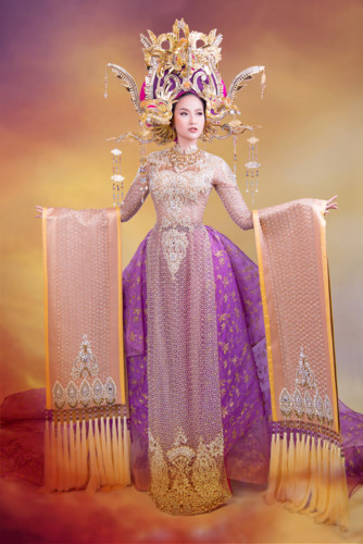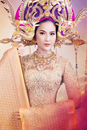 Lộng lẫy và uy nghi trong trang phục dân tộc lên, Khánh Ngân rất tự tin vào trang phục dân tộc có thể giúp cô ghi điểm tại cuộc thi.