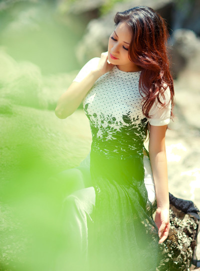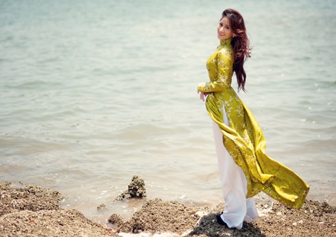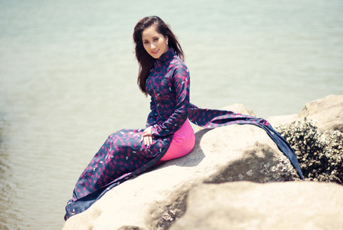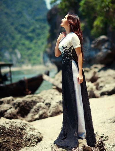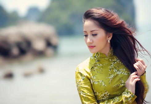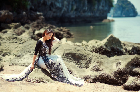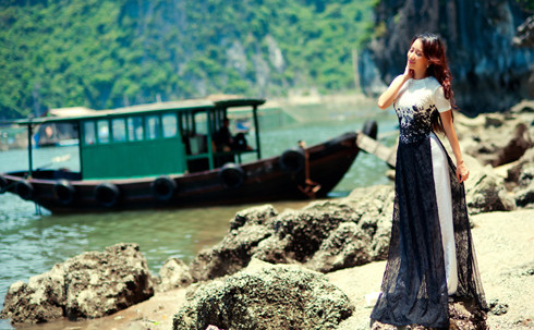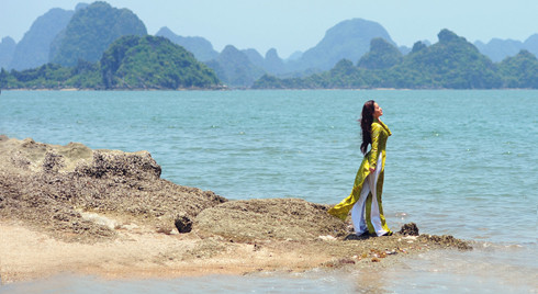 Nữ hoàng dance sport thả hồn vào cảnh sắc đất trời Hạ Long trong buổi chiều tà. Làn gió lộng thổi tung mái tóc và tà áo dài mềm mại đem tới cho Khánh Thi vẻ đẹp dịu dàng, say lòng người.