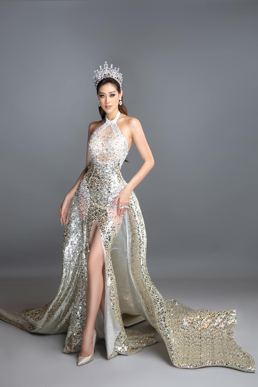 | Mẫu váy kết hợp 2 trong 1 - bên trong là kiểu đầm đuôi cá ôm sát cơ thể và xẻ tà cao kết hợp phần tùng váy bồng bềnh dài quét đất giúp bước đi thêm thướt tha. Chất liệu lấp lánh từ bề mặt vải được đính kết xen kẽ các phần xuyên thấu giúp "công chúa" Khánh Vân không chỉ xinh đẹp mà còn gợi cảm, quyến rũ. |