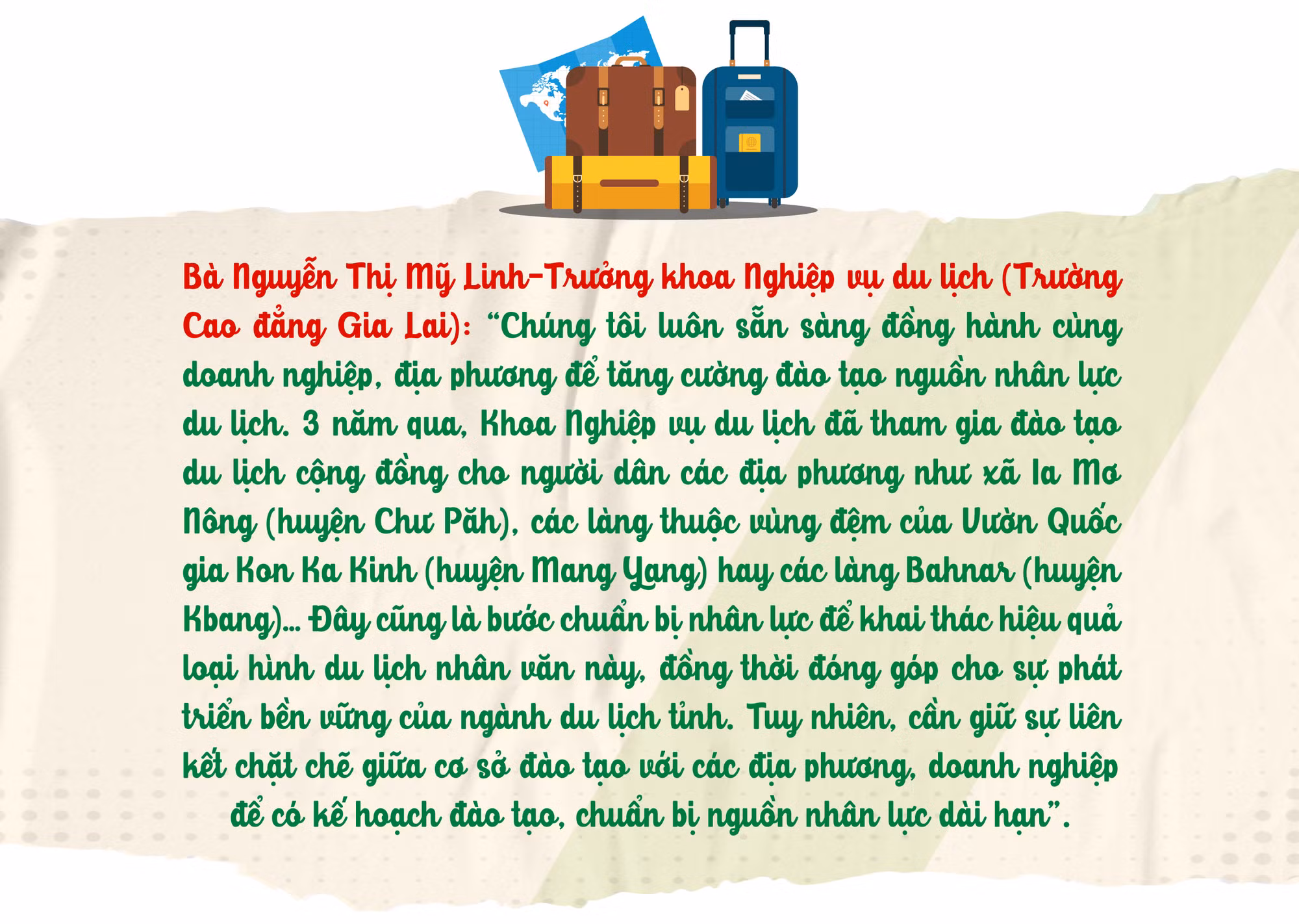 Tại cuộc họp Ban Chỉ đạo phát triển du lịch tỉnh đánh giá việc triển khai kế hoạch phát triển du lịch của tỉnh giai đoạn 2021-2025 vào tháng 8 vừa qua, vấn đề thiếu hụt nguồn nhân lực du lịch cũng được nhiều đại biểu quan tâm. Phó Chủ tịch UBND tỉnh Nguyễn Thị Thanh Lịch-Trưởng ban Chỉ đạo phát triển du lịch tỉnh-nhấn mạnh: Vấn đề nguồn nhân lực vướng ở đâu phải gỡ ở đó. Trường Cao đẳng Gia Lai với vai trò là cơ sở đào tạo, gặp khó ở đâu cần có kiến nghị, đề xuất với tỉnh để kịp thời tìm cách tháo gỡ, đồng thời ban hành chính sách phù hợp. Phó Chủ tịch UBND tỉnh cũng đề nghị Trường Cao đẳng Gia Lai cần phối hợp với Sở Văn hóa-Thể thao và Du lịch tiếp tục hỗ trợ, tập huấn chuyên môn cho người dân tại một số thôn, làng có tiềm năng phát triển du lịch cộng đồng, gắn phát triển du lịch với phát triển nông nghiệp.
