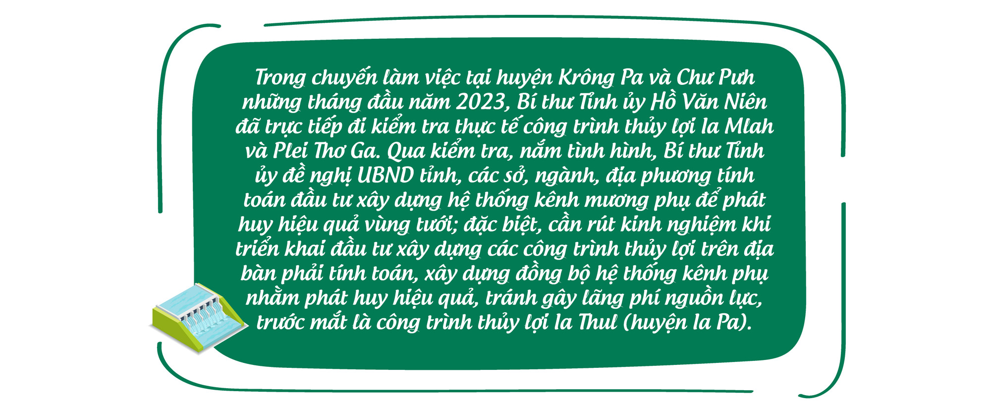 Ông Nguyễn Xuân Sang-Giám đốc Chi nhánh Thủy lợi Krông Pa (Công ty TNHH một thành viên Khai thác công trình thủy lợi Gia Lai) cũng thông tin: “Theo kế hoạch, giai đoạn 2022-2026, công trình hồ chứa nước Ia Mlah sẽ được đầu tư thêm hệ thống kênh mương nội đồng với tổng chiều dài trên 20 km thuộc địa phận thị trấn Phú Túc và 4 xã: Phú Cần, Chư Ngọc, Chư Gu, Ia Mlah. Khi đó, diện tích khu tưới cũng sẽ tăng lên”.
