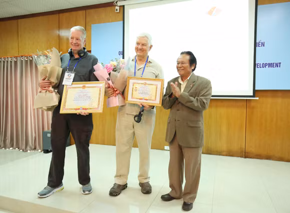 Ông Paul Cox (giữa) nhận bằng khen và Kỷ niệm chương “Vì hòa bình, hữu nghị giữa các dân tộc” (ảnh của vufo.org.vn)