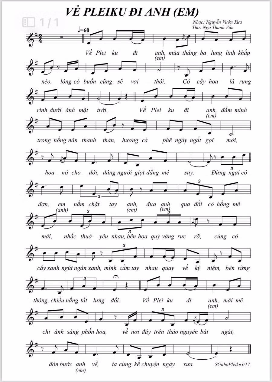 Ca từ, giai điệu thật trữ tình, êm ái: “Về Pleiku đi em/mùa tháng ba lung linh khắp nẻo/lòng có buồn cũng sẽ vơi thôi/cỏ cây hoa lá rung rinh dưới ánh mặt trời/về Pleiku đi em/đắm mình trong nồng nàn thanh thản/hương cà phê ngây ngất gọi mời…”.