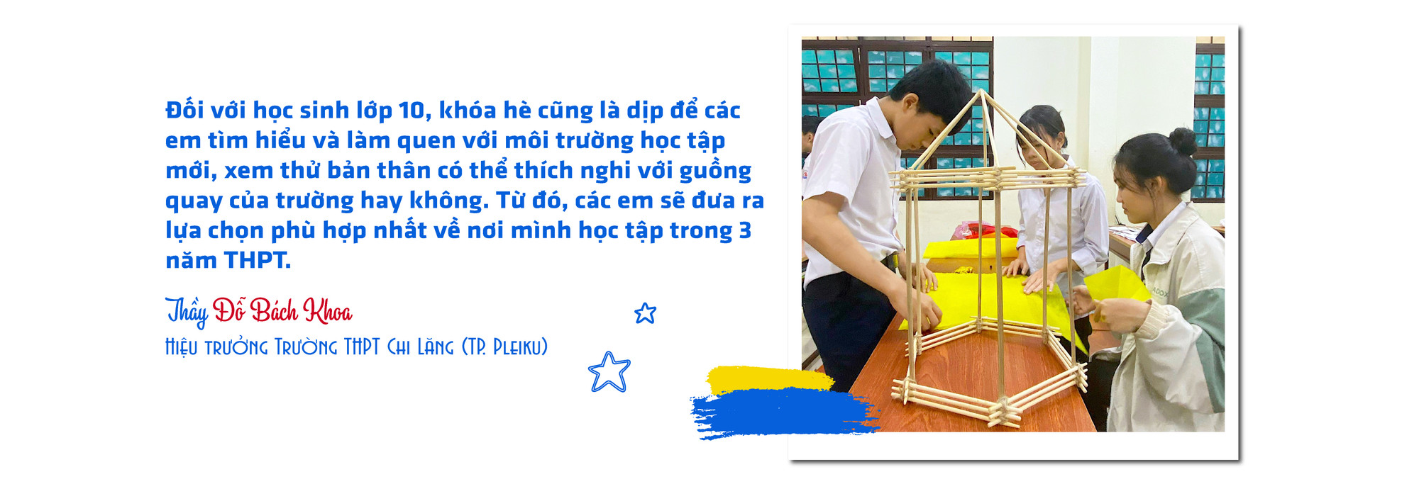Là đơn vị có thế mạnh về giáo dục STEM, Trường THPT Chi Lăng (TP. Pleiku) đã tận dụng thời gian hè để giúp học sinh thỏa sức sáng tạo và rèn luyện kỹ năng. Đây là lần thứ 4 trường tổ chức khóa hè và hầu như năm nào cũng thu hút khá đông học sinh đăng ký tham gia. Theo thầy Đỗ Bách Khoa-Hiệu trưởng nhà trường, khóa sinh hoạt hè năm nay có 980 học sinh ở cả 3 khối tham gia; riêng khối 10 khoảng 350 em. Đây là số đã qua vòng sơ tuyển (ban đầu có hơn 600 hồ sơ của học sinh khối 10 đăng ký) nhằm đảm bảo chất lượng sinh hoạt và phù hợp với cơ sở vật chất hiện có.