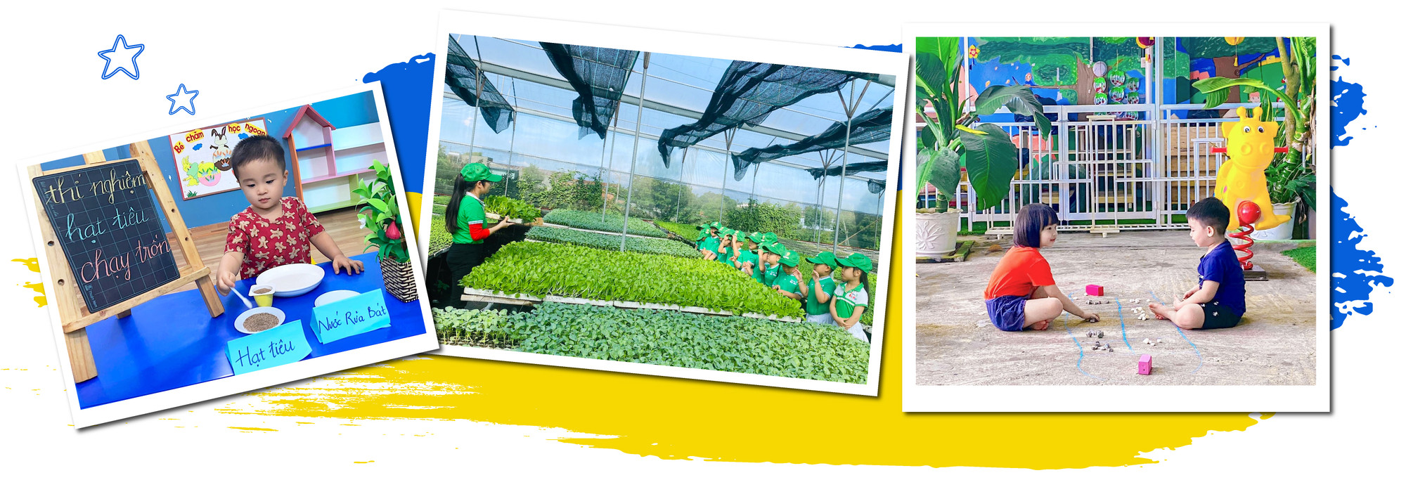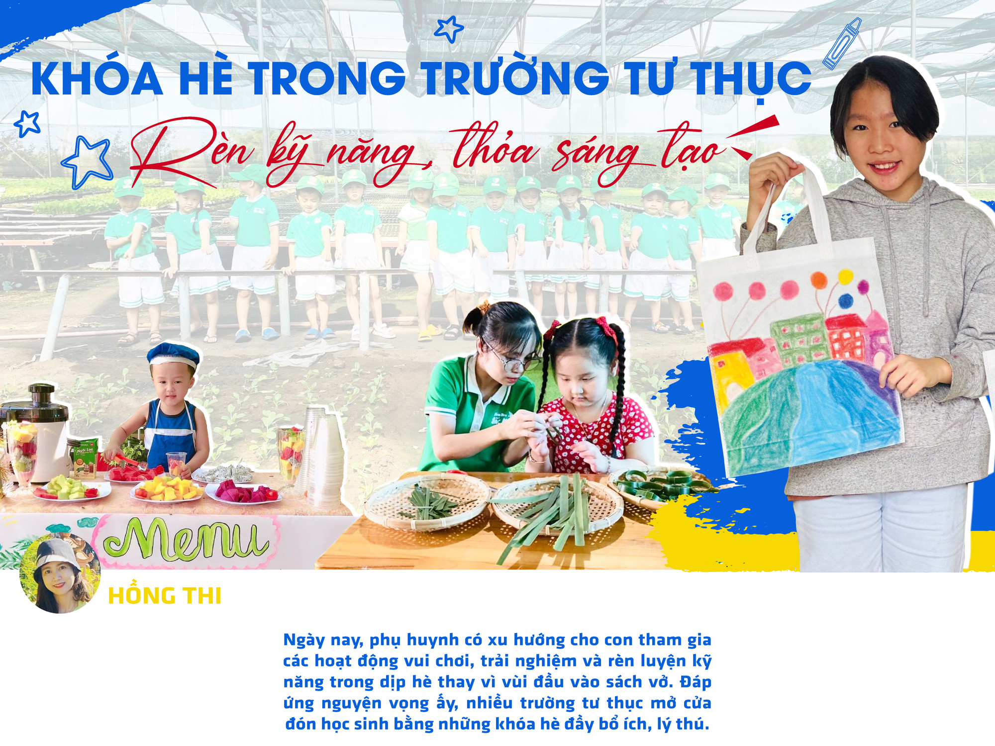 Với phương châm đó, thời gian qua, đội ngũ giáo viên trong trường đã tích cực tạo nhiều sân chơi cho trẻ, từ aerobic, yoga, tiếng Anh giao tiếp đến các hoạt động sáng tạo, rèn kỹ năng sống. Cô Lê Kiều Oanh-giáo viên chủ nhiệm lớp lá 2-chia sẻ: Lớp tôi phụ trách trong hè có 22 trẻ. Hầu hết các bé đều hào hứng cùng cô học kỹ năng bơi, làm các thí nghiệm vui, làm đồ chơi từ lá dừa hay hòa mình vào các trò chơi dân gian như: kéo co, cướp cờ, ô ăn quan… Trẻ cũng rất thích thú khi được nhà trường tổ chức cho đi tham quan, trải nghiệm tại vườn ươm hay đóng vai đầu bếp để pha chế ra những ly nước giải khát mùa hè tại “Lễ hội nước”.
