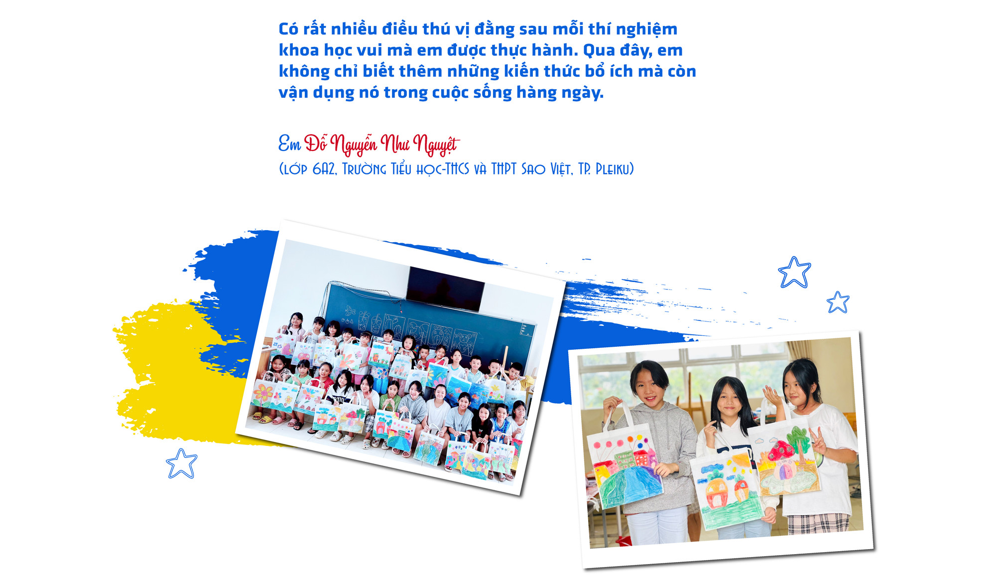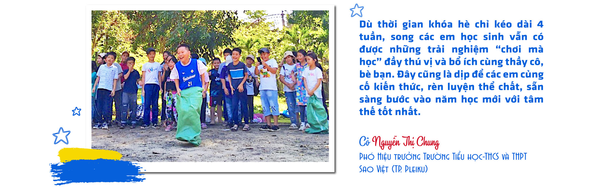 Khóa hè 2023 tại Trường Tiểu học-THCS và THPT Sao Việt bắt đầu từ ngày 26-6 và khép lại vào 22-7, dành cho tất cả học sinh từ lớp 1 đến lớp 9 có nhu cầu. Trước đó, sau khi kết thúc năm học 2022-2023, nhà trường đã thông báo tuyển sinh rộng rãi cho khóa hè và thu hút 140 em đăng ký. Theo Phó Hiệu trưởng Nguyễn Thị Chung, khóa hè vẫn tổ chức bán trú, có xe đưa đón học sinh. Nhà trường chia theo lớp, xây dựng thời khóa biểu cụ thể và phân công giáo viên chủ nhiệm để quản lý chung. Chương trình khóa hè chủ yếu hướng đến kỹ năng học tập bộ môn, thực hành khoa học vui, luyện chữ đẹp, tiếng Anh giao tiếp, kỹ năng tin học ứng dụng cho học sinh; đồng thời, tạo điều kiện để các em thỏa sức cùng đam mê với các bộ môn năng khiếu như: bóng đá, vẽ, đàn… Ngoài ra, nhà trường còn tổ chức dạy bơi với thời lượng 8 tiết/lớp/tuần nhằm trang bị cho học sinh những kiến thức, kỹ năng cần thiết để phòng tránh tai nạn đuối nước.