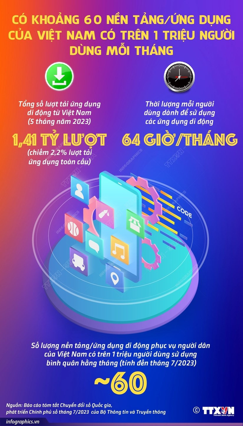 Đến tháng 7/2023, có khoảng 60 nền tảng/ứng dụng di động phục vụ người dân của Việt Nam có trên 1 triệu người dùng sử dụng bình quân hằng tháng.