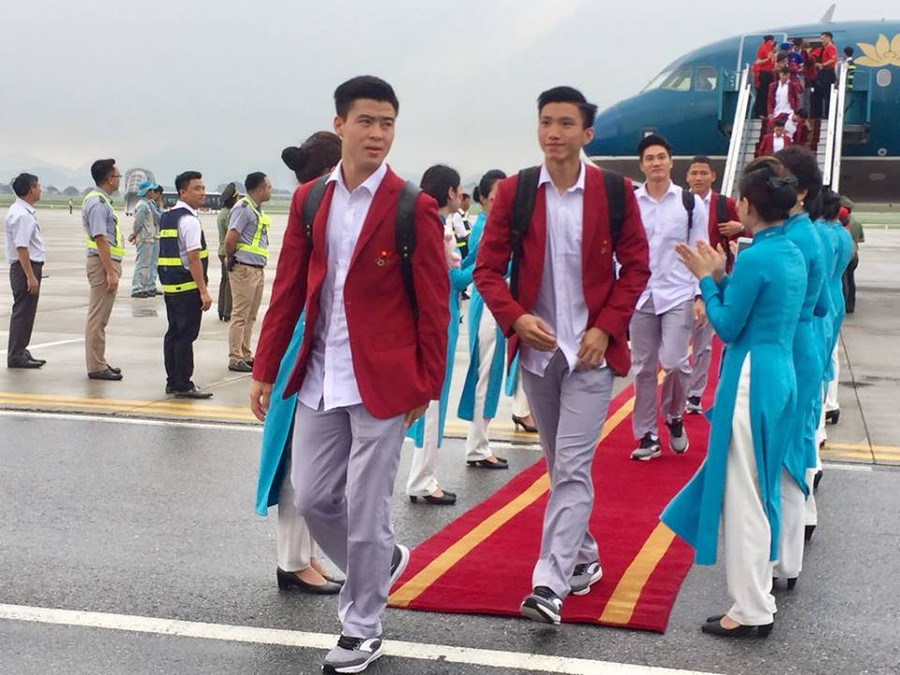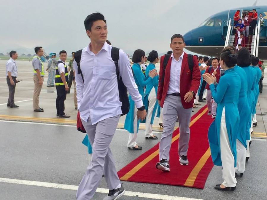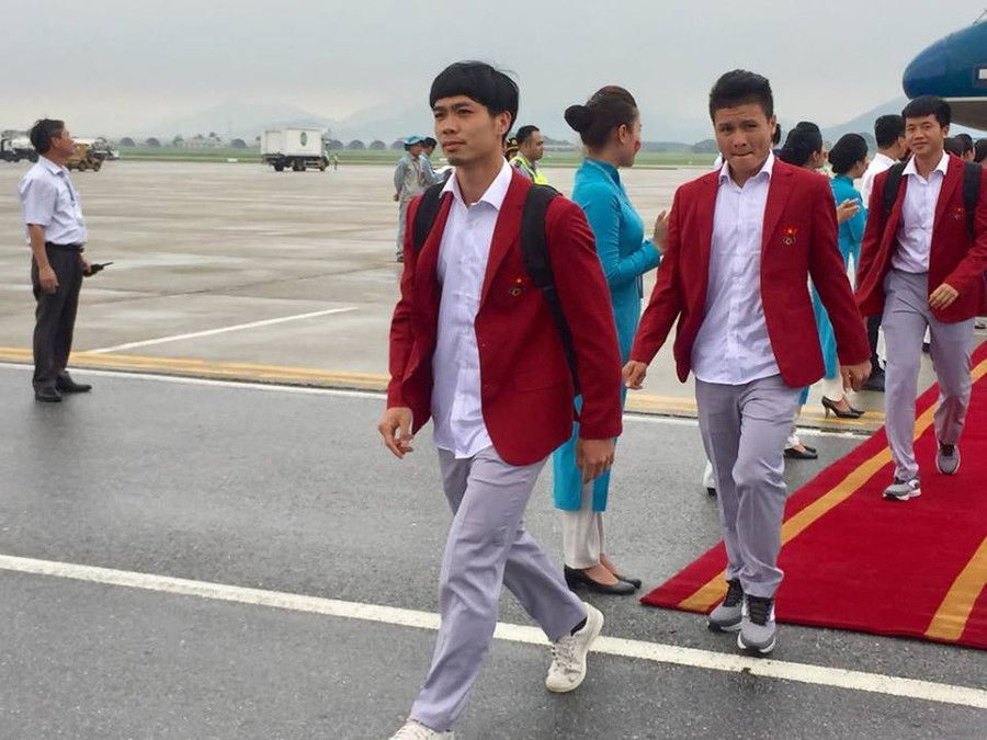 | Ảnh: Zing - Diện sơ mi trắng cùng áo vest đỏ các cầu thủ Olympic Việt Nam ai cũng tươi cười, rạng rỡ như những nam thần |