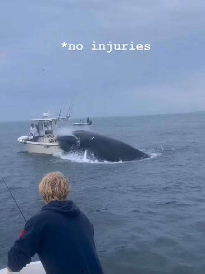 Khoảnh khắc một con cá voi lưng gù lao lên khỏi mặt nước và nhảy lên chiếc thuyền đã được camera ghi lại, xảy ra ở ngoài khơi bờ biển New Hampshire ở Mỹ.