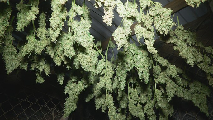 | Hàng trăm chùm hoa cần sa đang được phơi khô để bán với giá 3 triệu đồng/kg |