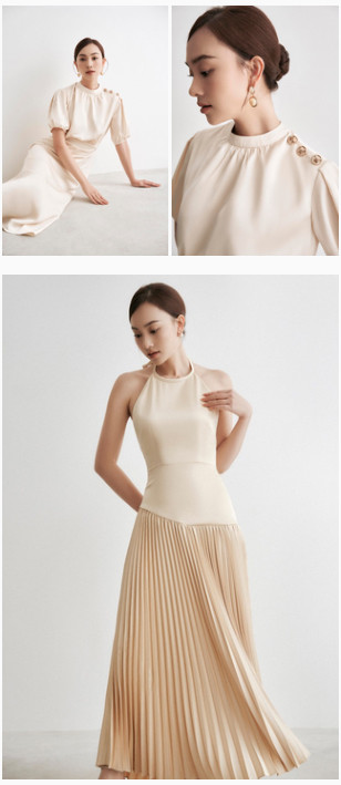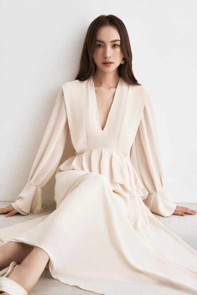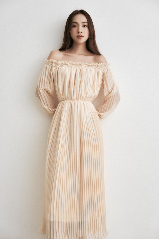 Chiếc đầm màu be tôn lên những nét đẹp nhất của người thiếu nữ - bờ vai thon, làn da tươi trẻ, vóc dáng thanh mảnh mà không cần đến phom dáng bó sát hay cắt khoét phức tạp. Thiết kế khéo léo tạo ra vẻ mềm mại và nữ tính qua những đường xếp ly, xếp nhún hay bo thun tinh tế nơi vòng eo.