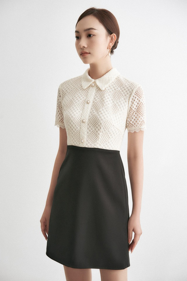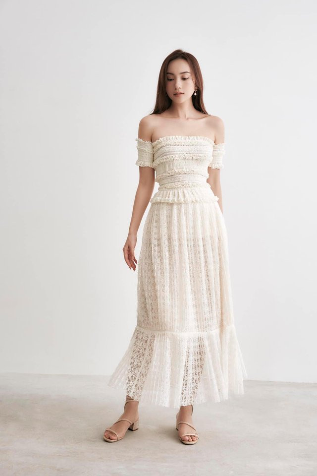 Chân váy ren dáng xòe kết hợp áo crop top trễ vai có sự co giãn linh hoạt, chiều lòng mọi vóc dáng.