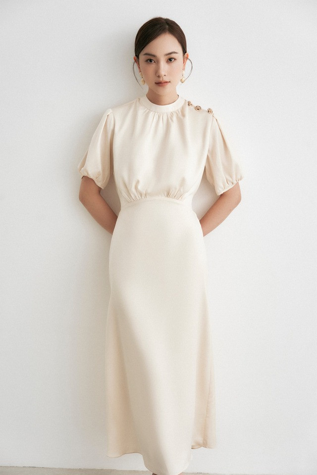 Váy dáng dài cổ tròn ôm nhẹ, được tạo điểm nhấn bằng cấu trúc nhún nhẹ tạo sự chú ý cho vòng eo, hàng cúc trên vai trở thành một điểm nhấn tinh tế cho trang phục.