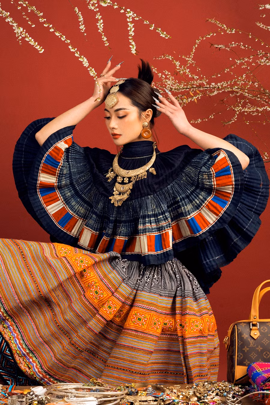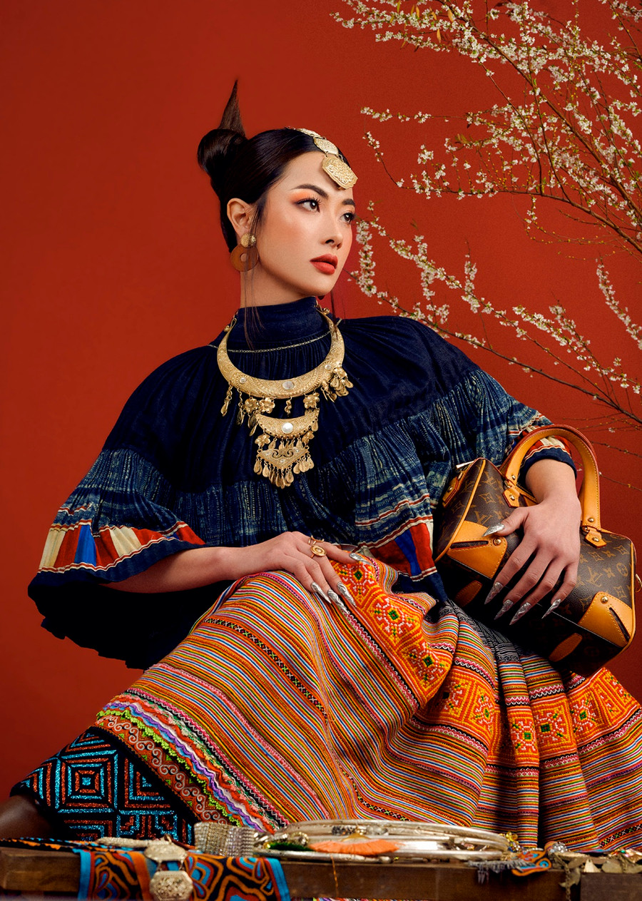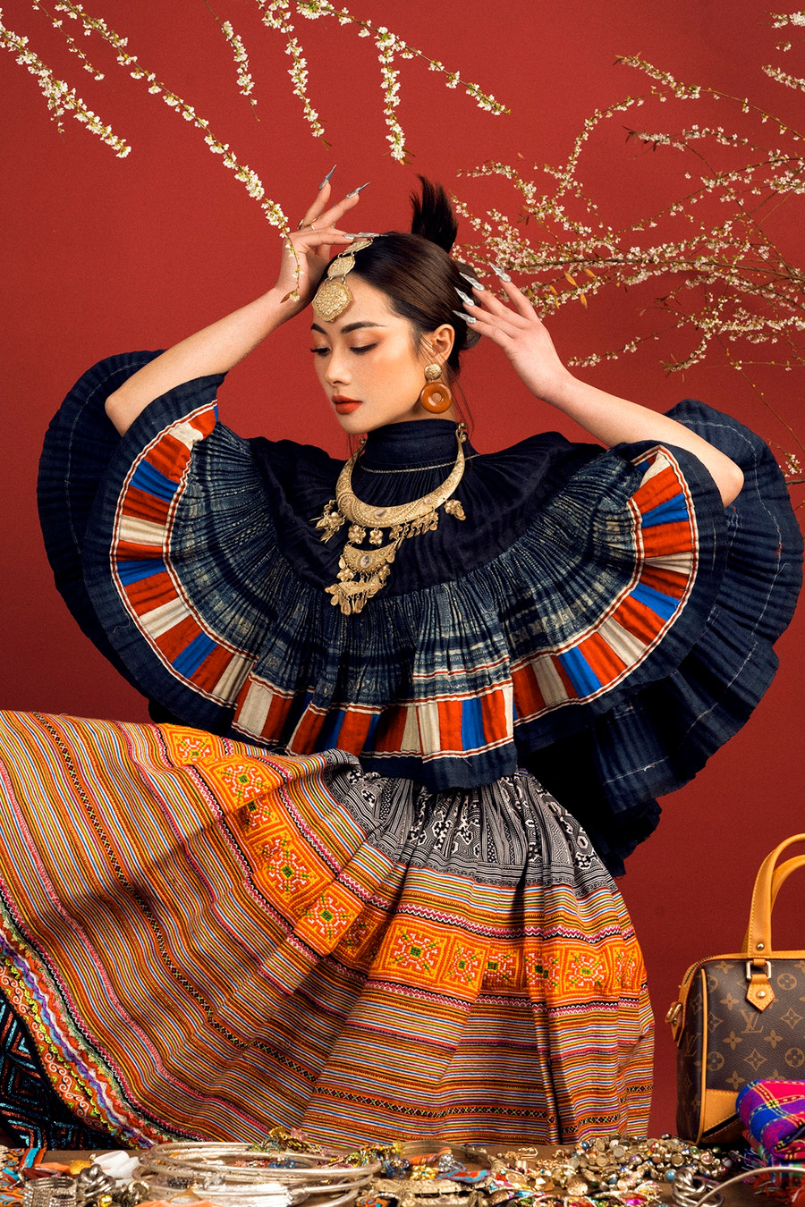Huyền Thạch cũng chia sẻ thêm rằng, để giữ gìn bản sắc dân tộc và giao thoa thời trang, stylist đã mix & match cùng áo bông trần - một nét tinh túy của người Hà Nội nói riêng và người miền Bắc nói chung từ những chiếc bông trần của người dân tộc thiểu số. Nhờ vậy, outfits lần này thực sự là một mùa xuân mới tươi đẹp và ngập tràn sắc màu như cô gái H'Mông, Dao đi phiên chợ xuân đẹp, như nhánh lan rừng khoe sắc.