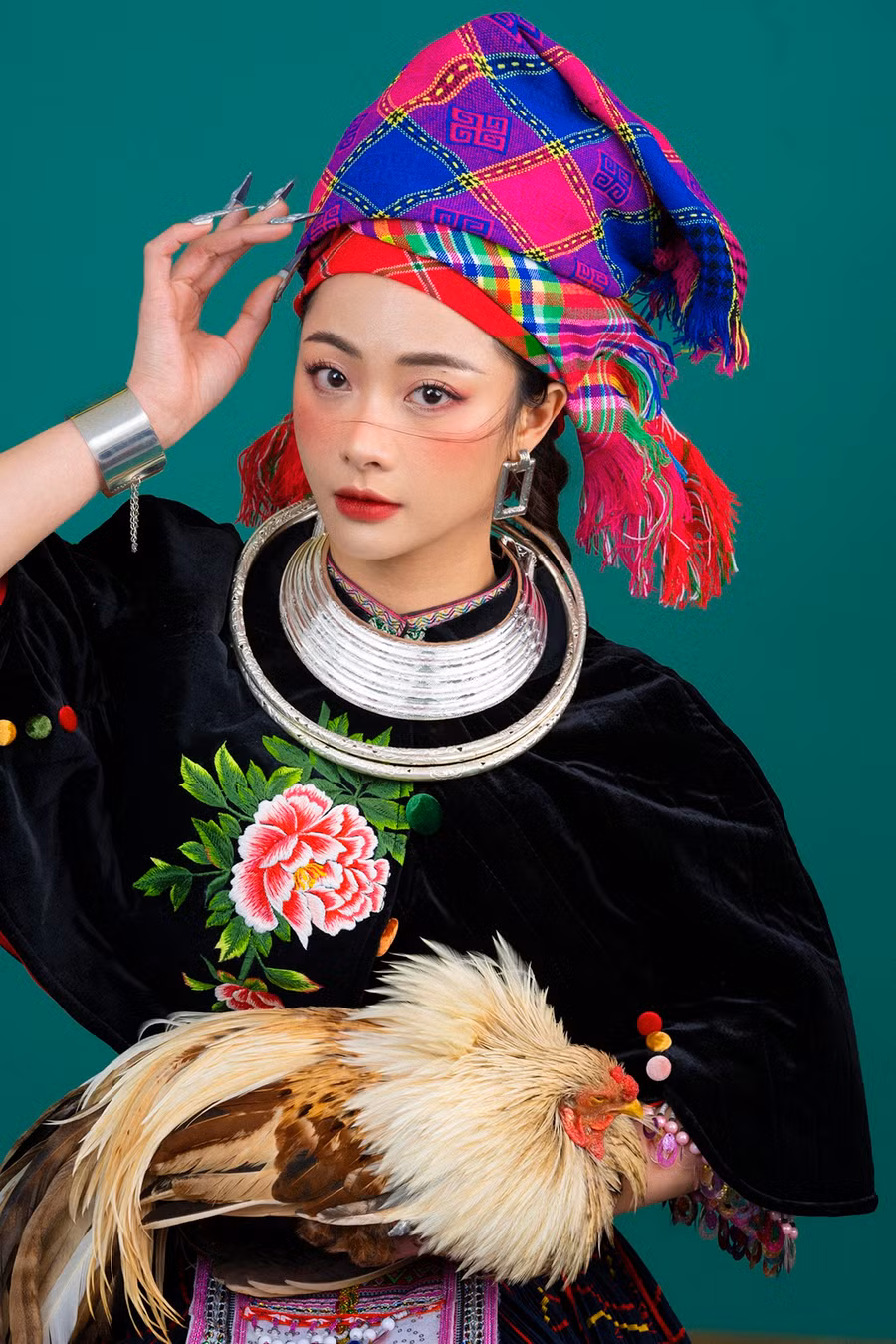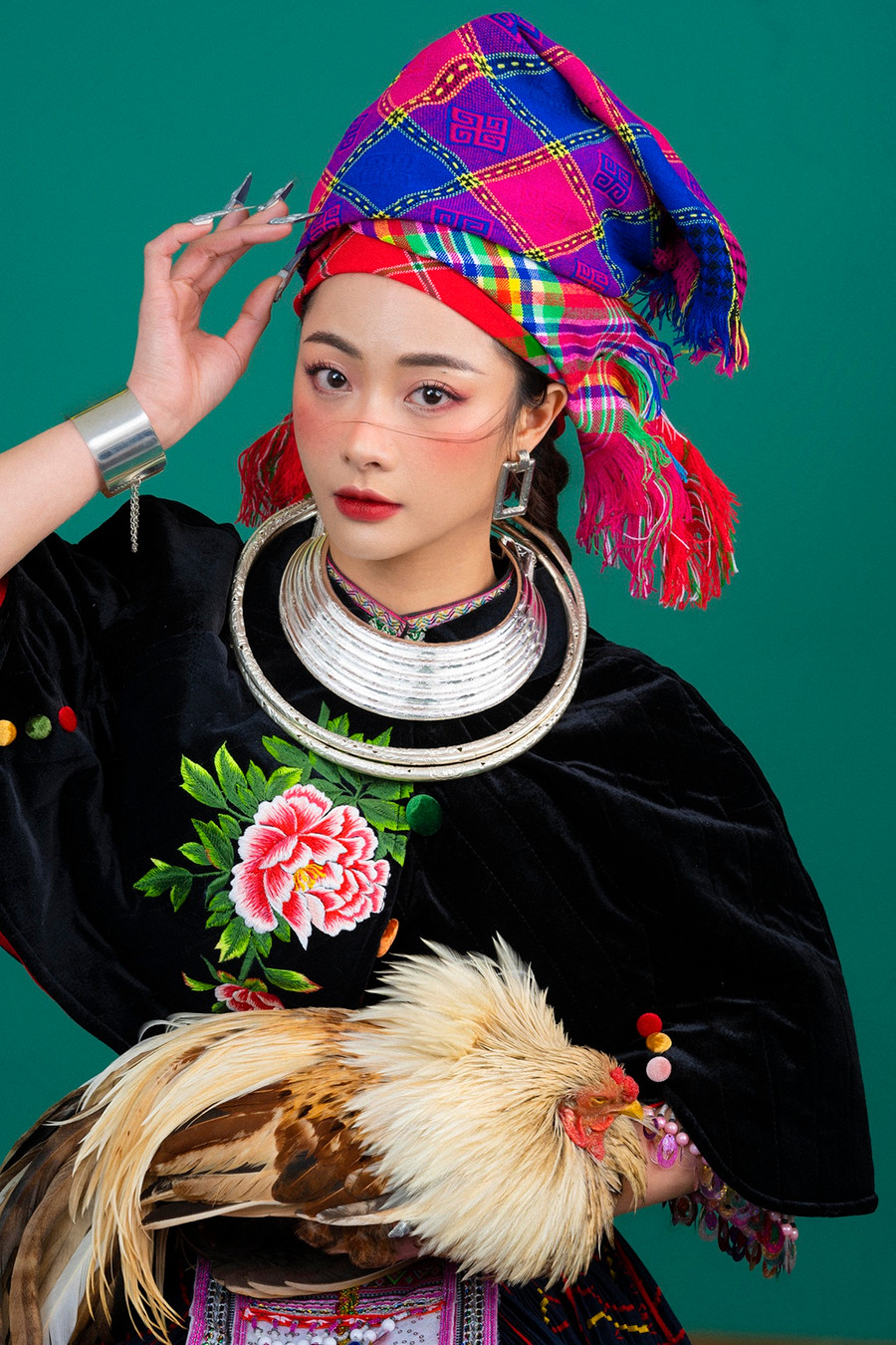 Hình ảnh Huyền Thạch trong bộ trang phục đậm nét truyền thống của đồng bào H'Mông. Chi tiết chiếc khăn thổ cẩm truyền thống được vấn làm nhiều tầng cùng vòng bạc cỡ lớn đã được cô cùng ê kíp lựa chọn để tạo thành điểm nhấn cho bộ trang phục.