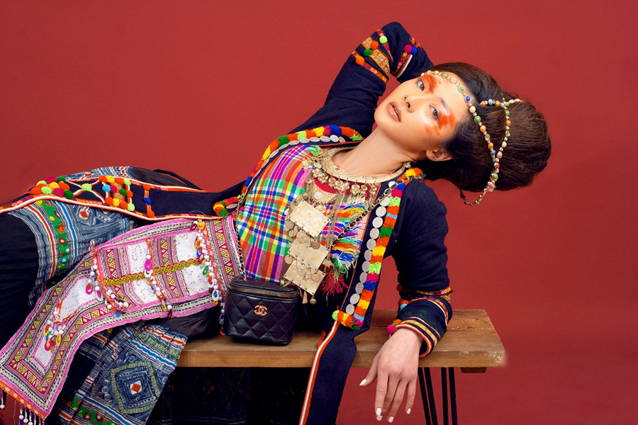 | Ma mị và đầy táo bạo, cô và ê kíp cũng đã mạnh dạn lựa chọn đôi sling black gót vuông cùng túi chanel trong bộ trang phục mang đậm nét truyền thống của người Dao. |