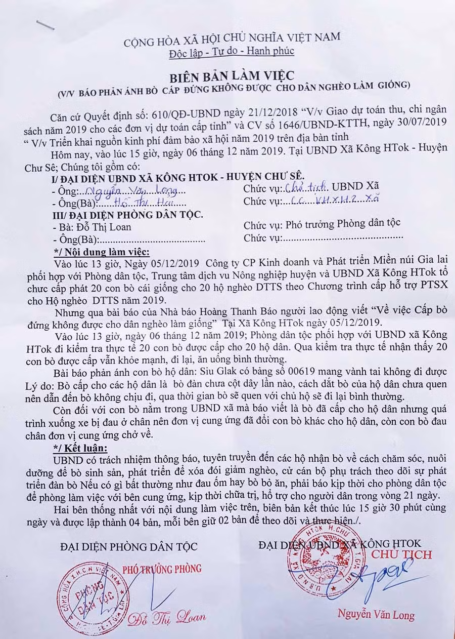 (GLO)- Phòng Dân tộc huyện Chư Sê vừa phối hợp với UBND xã Kông Htok, huyện Chư Sê, tỉnh Gia Lai tổ chức kiểm tra, xác minh thông tin báo chí và mạng xã hội phản ánh nhiều con bò được cấp theo Chương trình hỗ trợ phát triển sản xuất cho hộ nghèo dân tộc thiểu số năm 2019 ở xã Kông Htok vào ngày 5-12-2019 không đứng được, người dân phải dùng nhiều biện pháp để chở về nhà.