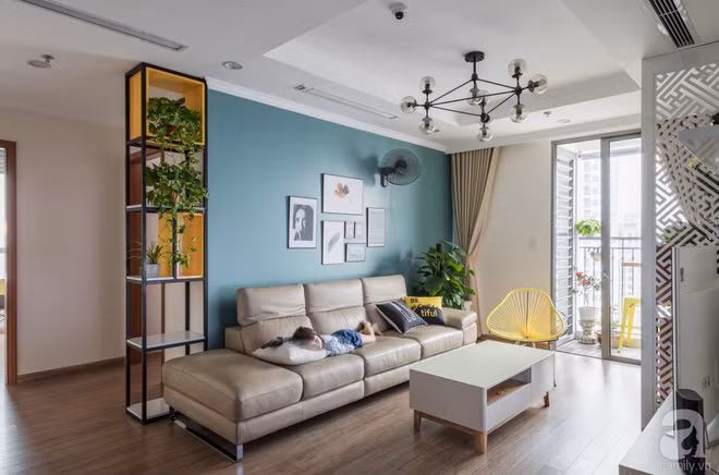 Góc phòng khách đẹp như mơ với màu trung tính nền nã cùng điểm nhấn màu xanh tự nhiên.