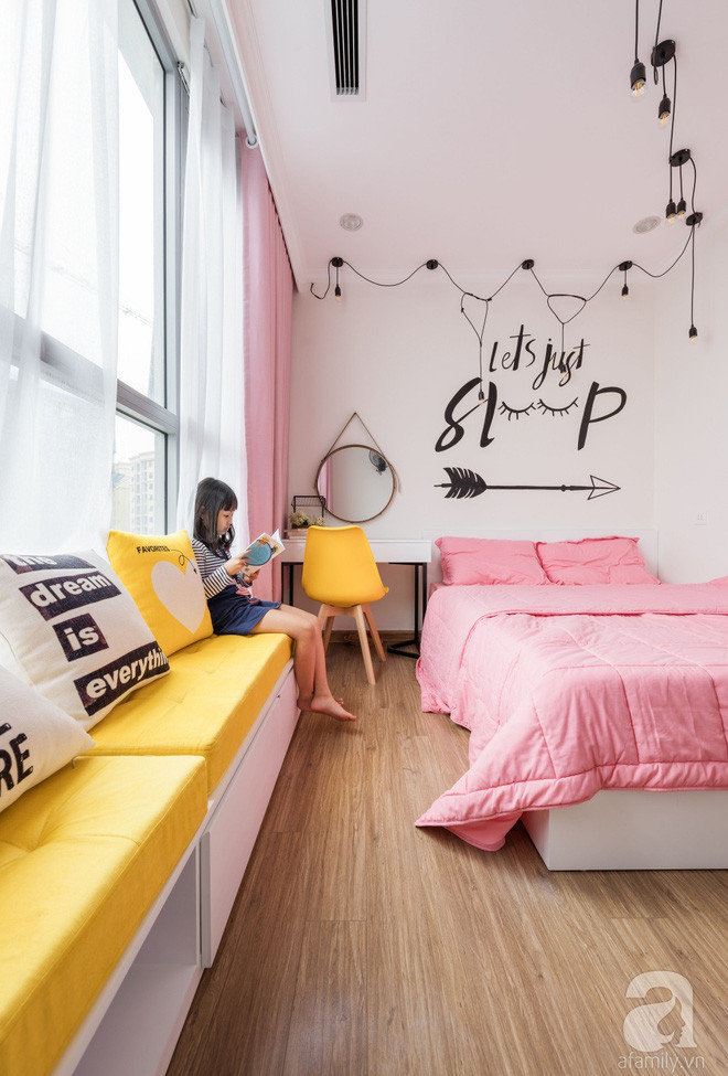 Màu trắng và màu gỗ làm nền cho tông hồng và vàng thêm nổi bật, thêm đáng yêu và tinh nghịch.