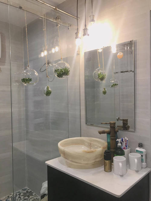Nhà vệ sinh được thiết kế gọn gàng, xinh xắn. Anh sử dụng những "chậu cây không khí" tạo không gian xanh.