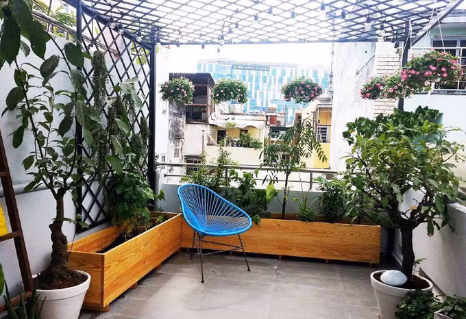 Tầng trên cùng là khu thờ và sân vườn. Anh thiết kế sân vườn như một quán cafe mini.