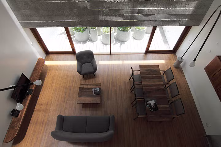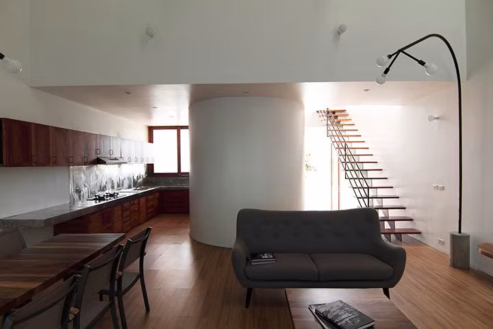 Vật liệu bê tông luôn tạo ra những xúc cảm đặc biệt khi ánh sáng đi qua, kết hợp với đồ nội thất bằng gỗ mộc mạc, Tất cả tạo môi trường ấm cúng và thân thiện nhất cho căn nhà.