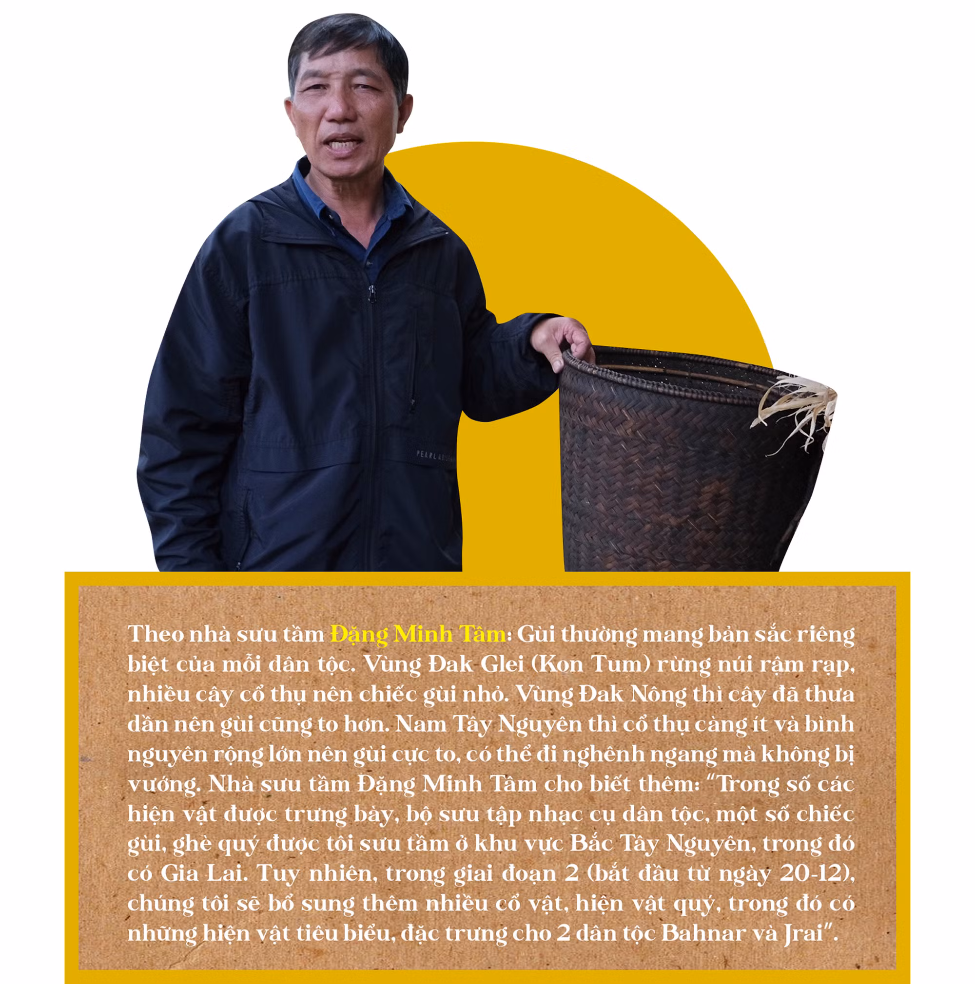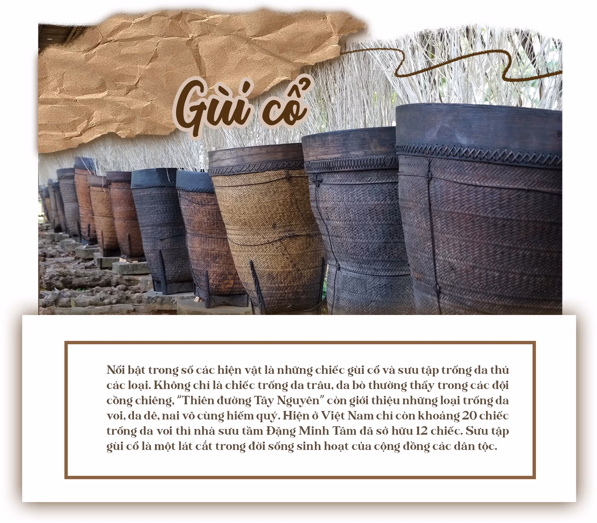 Hàng ngàn hiện vật, cổ vật được trưng bày thành từng chủ đề như các sưu tập gùi cổ, trống da, các loại nỏ săn bắn, nhạc cụ dân tộc, công cụ phục vụ sản xuất và đời sống, thổ cẩm đặc trưng của các tộc người, vườn tượng gỗ, sưu tập ghè cổ… Không gian còn tái hiện đời sống văn hóa, sinh hoạt đời thường của cư dân Tây Nguyên với những nếp nhà rông, nhà sàn. Hiện vật trưng bày trong không gian làng, rừng tạo thành một nhịp điệu tương quan nối liền các thời kỳ, từ buổi sơ khai đến nay vẫn không hề tách rời với cội nguồn tự nhiên. Chúng tôi tin rằng không gian trưng bày thực sự trở thành “thiên đường” cho những người yêu mến văn hóa Tây Nguyên bước vào để thưởng thức vẻ đẹp giản dị mà đầy minh triết của một nền văn hóa được sinh ra từ rừng.