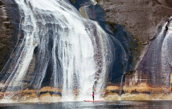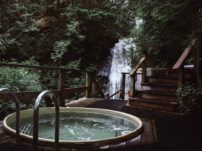 Bạn có thể ngâm mình trong hai bồn tắm nước nắm cạnh thác nước hùng vĩ, ngắm đỉnh núi phủ tuyết phía xa. Bạn cũng có thể đi theo cầu thang xuống bơi ở hồ dưới chân thác. Ảnh: Business Insider.