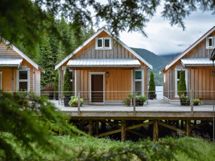 Nimmo Bay có 9 cabin, trong đó 6 cabin Intertidal nằm ở mép nước và 4 cabin khác nằm trong rừng. Điều đặc biệt là khi thủy triều lên, các cabin Intertidal sẽ trở thành các lều gỗ trên mặt nước. Ảnh: Trevor Morrow.